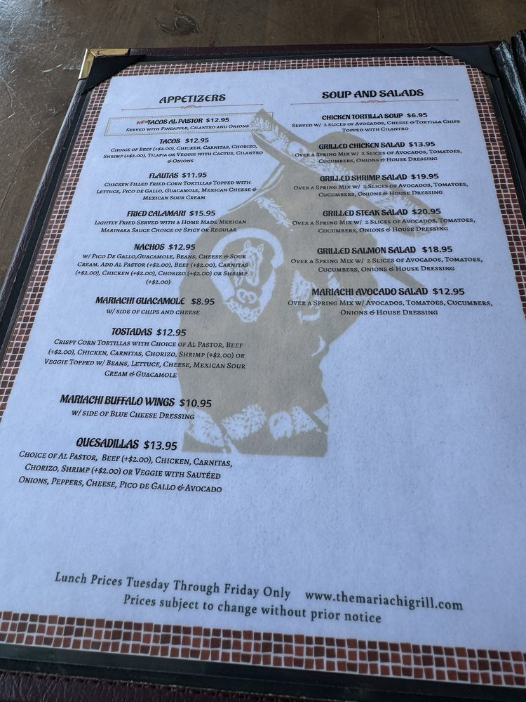 Whether you’re dining in, opting for takeout, or enjoying their happy hour specials, Mariachi Grill promises friendly service and a welcoming atmosphere, making it perfect for family outings or casual gatherings. With outdoor seating available, you can savor your meal in the fresh air amidst colorful decor. Don't forget to explore their refreshing aguas frescas and unique Mexican sodas!
